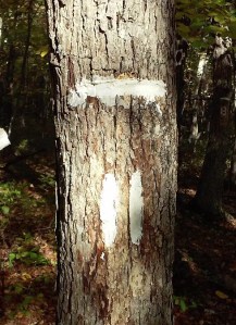 A line and the text 11 carved into a tree and filled in with white paint. Behind it two trees where marked 12 & 13 and looking around I saw these other trees.