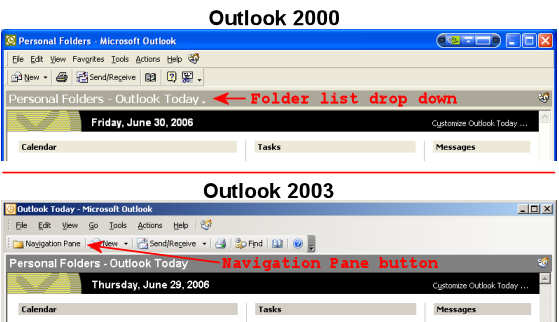 The last thing that bugged me was their removal of the built-in folder list drop down with pinning. I worked around the missing button by adding a Navigation Pane button just above where the old button was. This is a toggle button so for myself it is just as functional as the old button. You’ll get a better idea of what I did in this 2000 vs. 2003 picture.